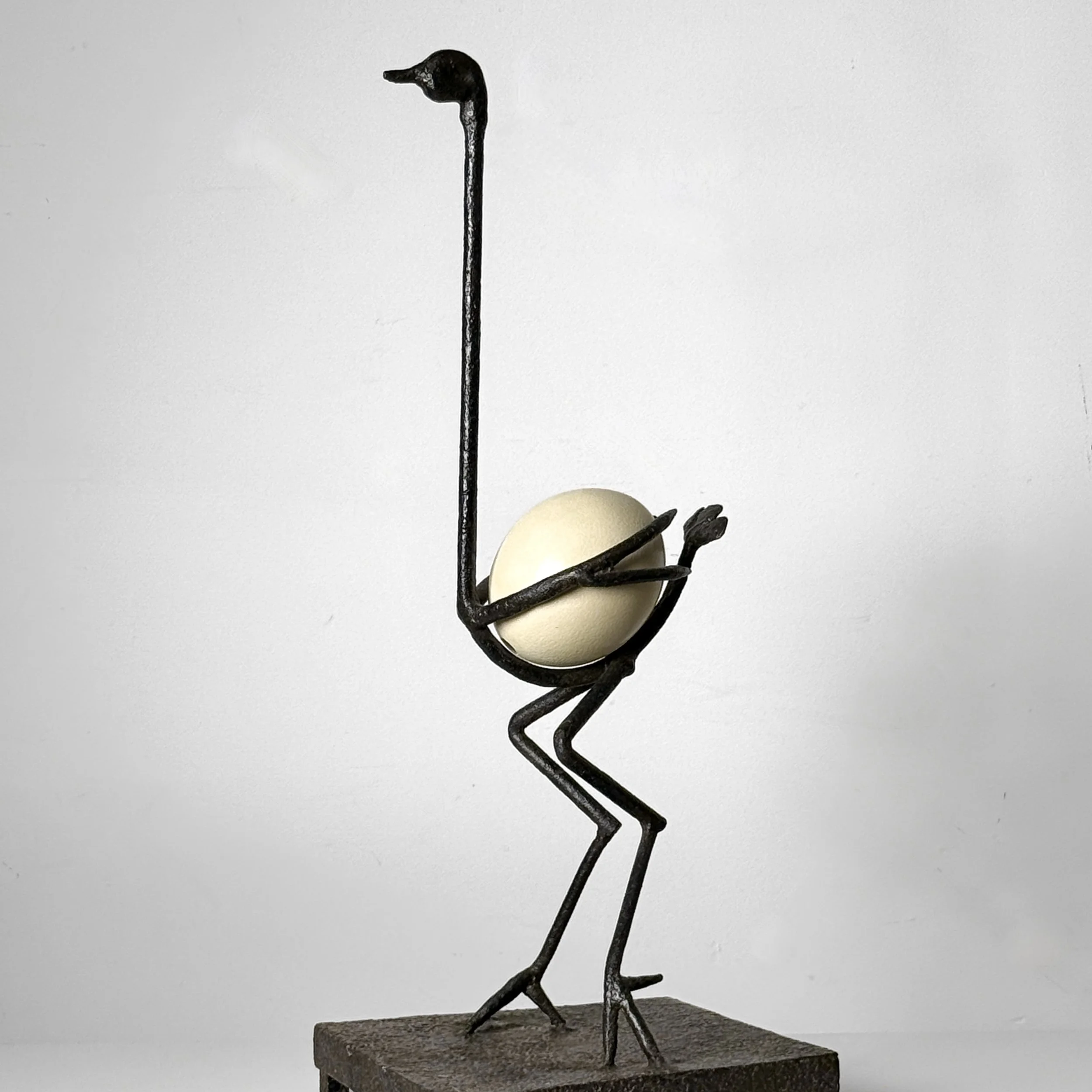 Minimalist abstract bird formed of patinated iron cradling an authentic ostrich egg body Mounted to a textured square pedestal base