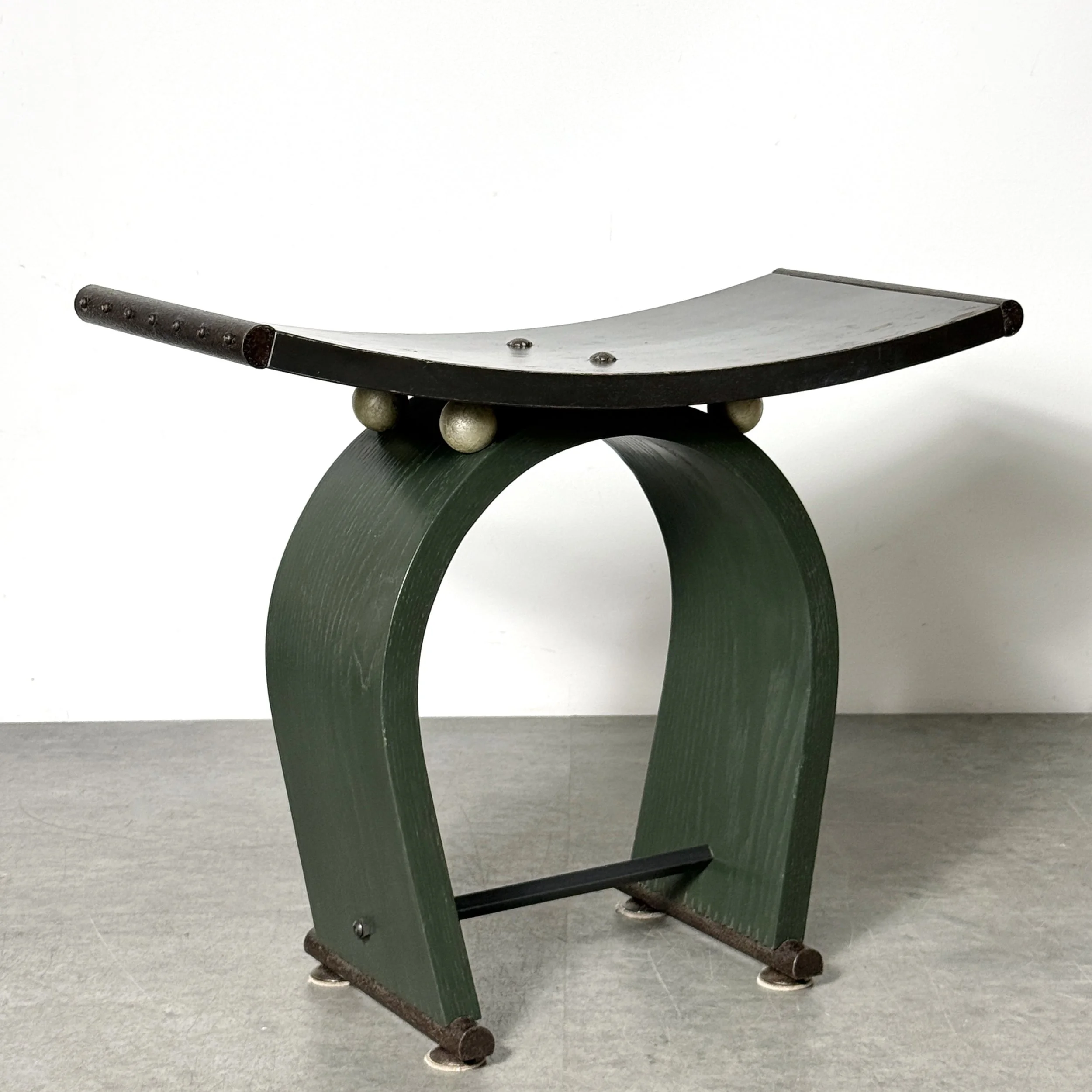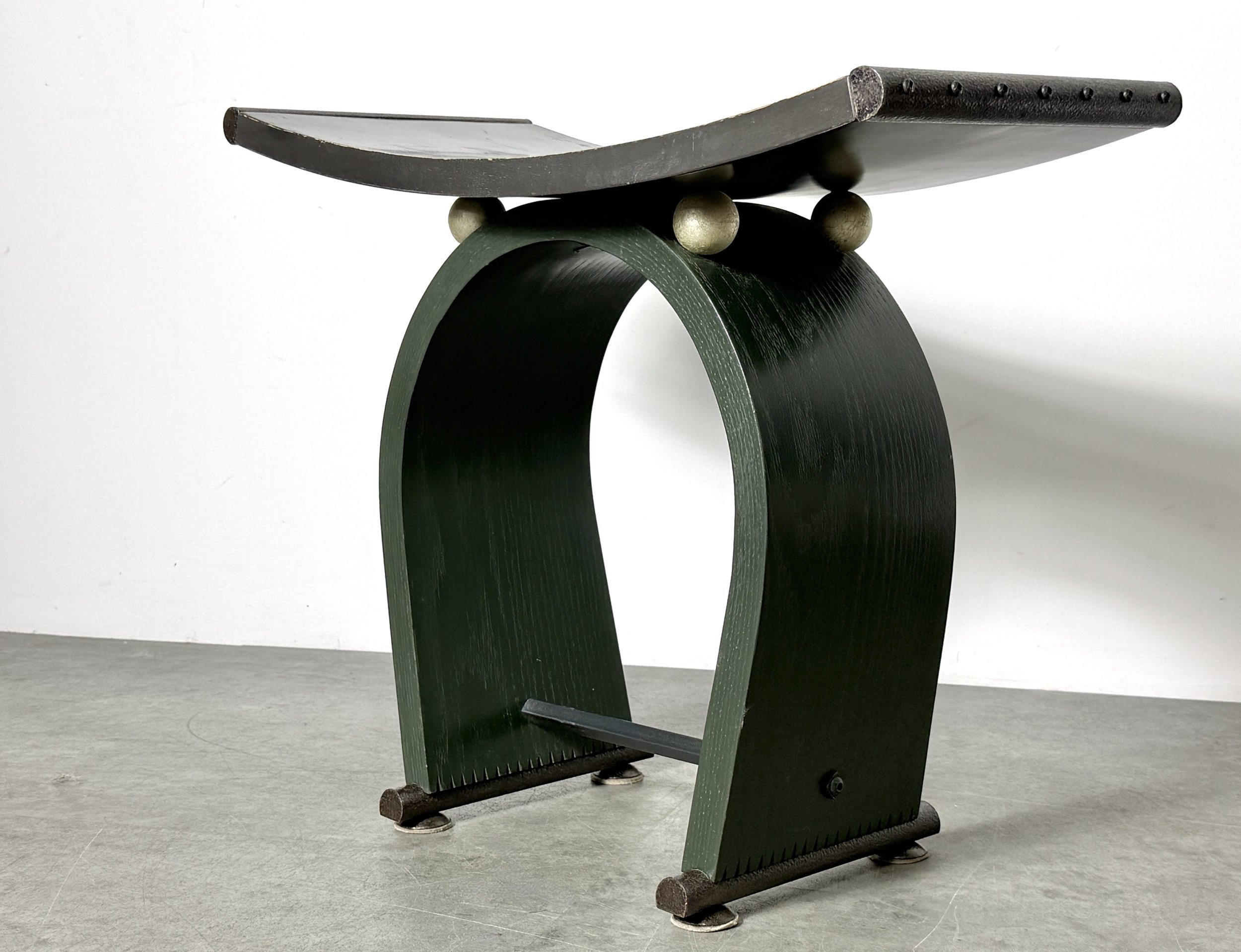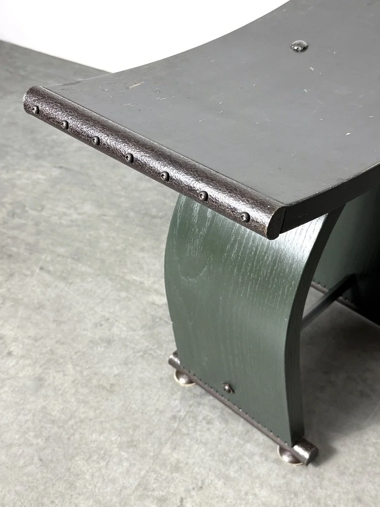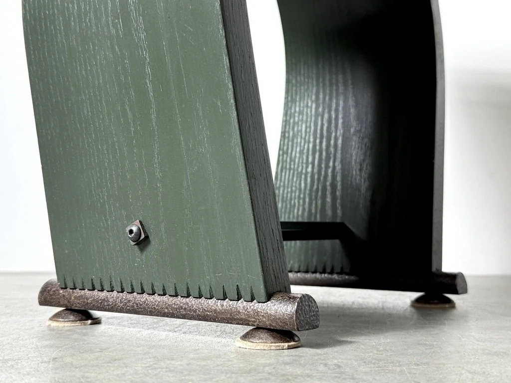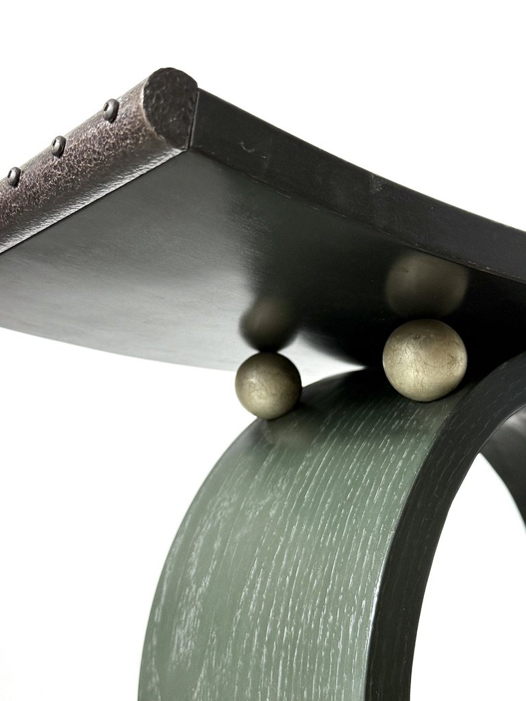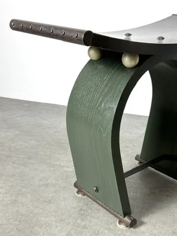 Webbed leather seat secured by oversized hammered wrought iron nail heads