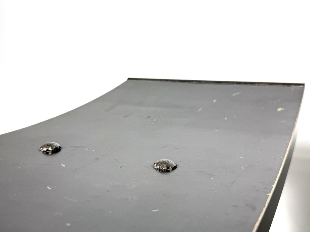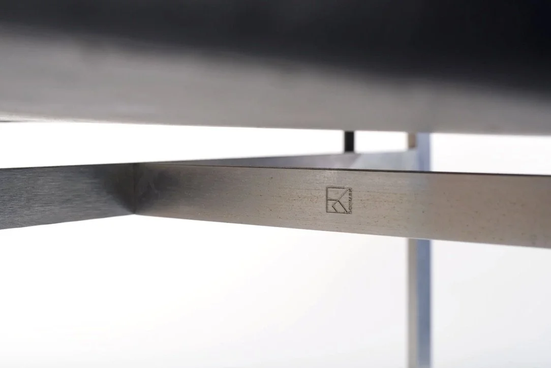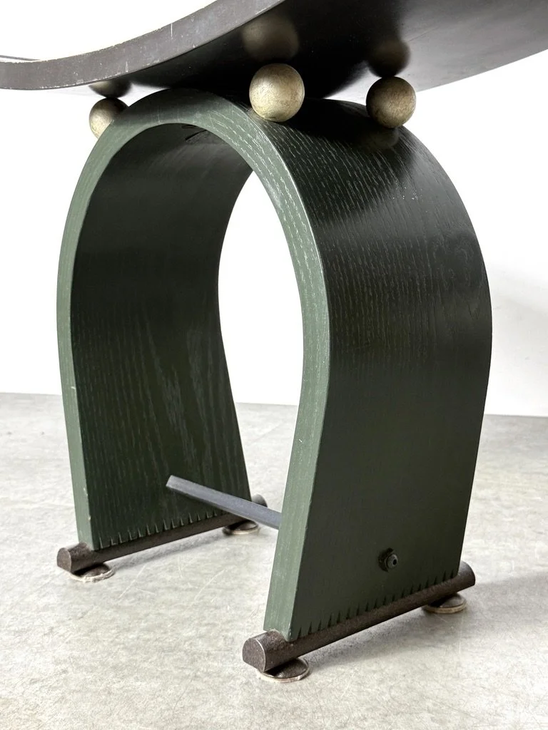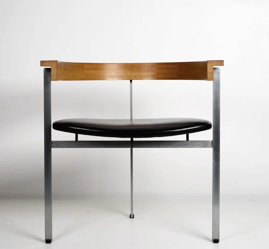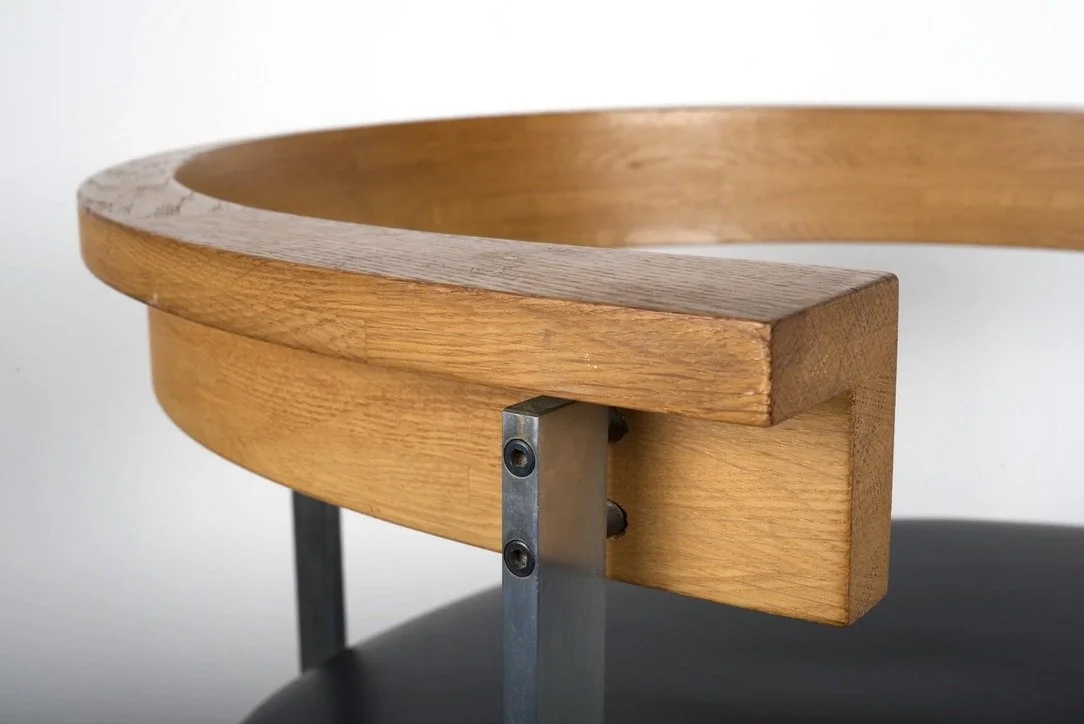 Webbed leather seat secured by oversized hammered wrought iron nail heads