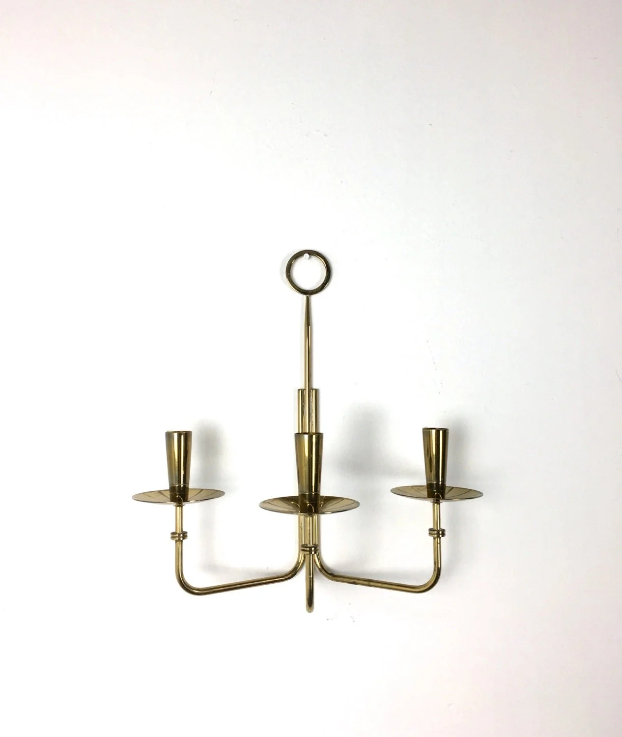 Rare brass wall hanging candelabra by Tommi Parzinger for Dorlyn, 1950's. Three conjoined candle holders with signature Parzinger details extend out from the center, hung by loop accent.